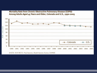 This document presents information on risk factors and outcomes related to chronic diseases. It discusses factors that influence health status such as lifestyle, environment and genetics. It provides data on leading causes of death in Colorado and risk factors among both adults and youth such as obesity, physical inactivity, smoking and high blood pressure. It also examines screening rates and disparities. Reducing risk factors like smoking and lowering cholesterol and blood pressure can help reduce diseases like cancer, cardiovascular disease, COPD and diabetes.