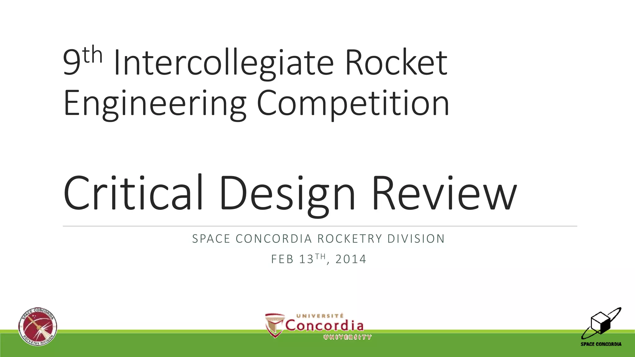 The document provides details of the hybrid rocket motor design for Space Concordia's entry in the 9th Intercollegiate Rocket Engineering Competition. The hybrid motor uses HTPB fuel and nitrous oxide oxidizer and is designed to reach an altitude of 10,000 feet. Key specifications discussed include the grain design, motor dimensions, injector design, and nozzle parameters.