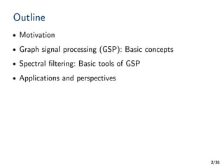 This document discusses graph signal processing and its applications. It begins by motivating the need to analyze structured data as graphs rather than as independent points. It then introduces basic concepts in graph signal processing such as representing data as graph signals on vertices, defining the graph Laplacian, and generalizing the Fourier transform to the graph spectral domain. The document outlines applications of graph signal processing tools like spectral filtering to domains such as social networks, transportation, and biomedicine.