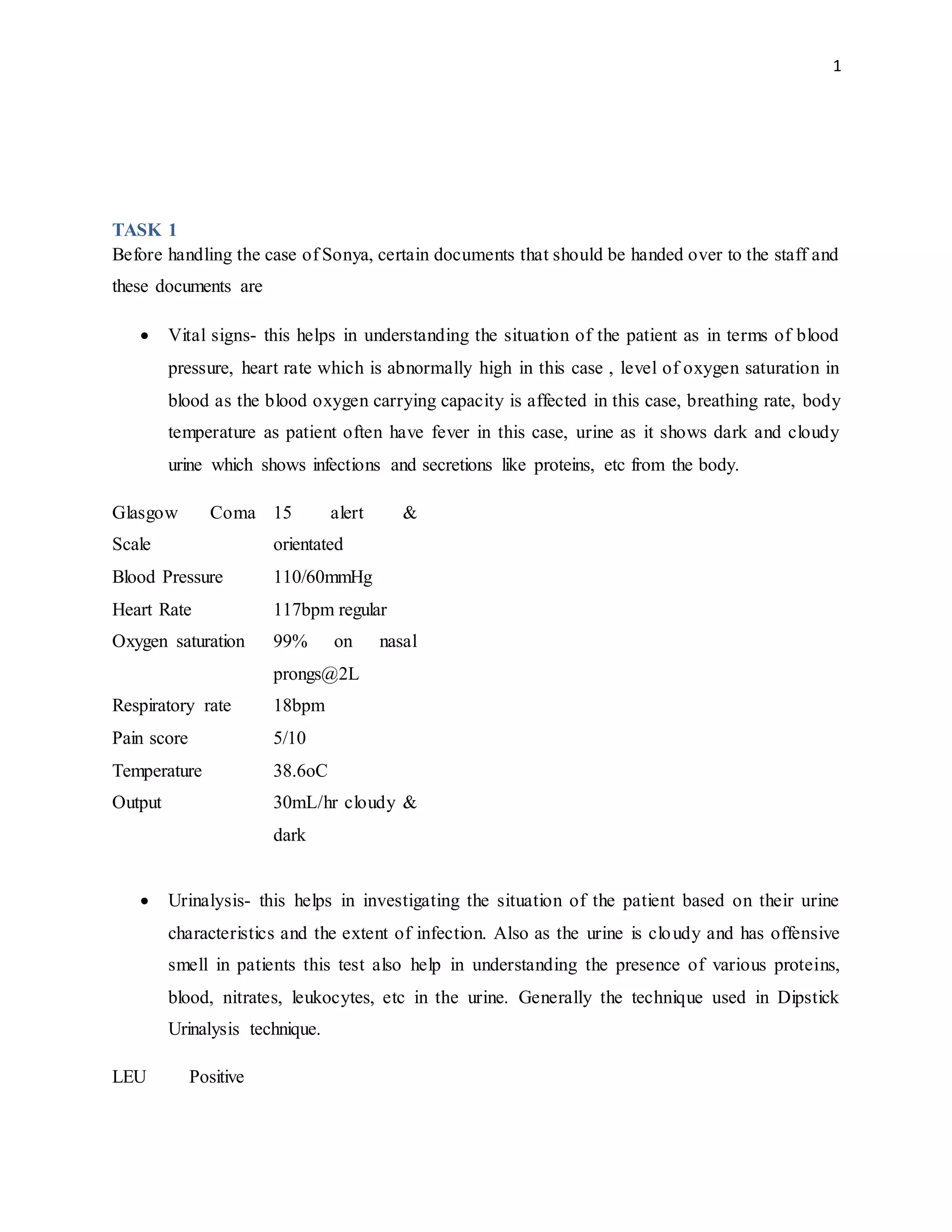The document outlines the critical nursing care plan for a patient named Sonya suffering from acute urinary tract infection and pyelonephritis, highlighting essential diagnostic tests, treatment protocols, and necessary documentation. It emphasizes the importance of monitoring vital signs, pain management, and timely administration of medications to prevent complications such as renal failure and sepsis. The report also details the interventions required and the nursing responsibilities in ensuring patient safety and effective recovery.