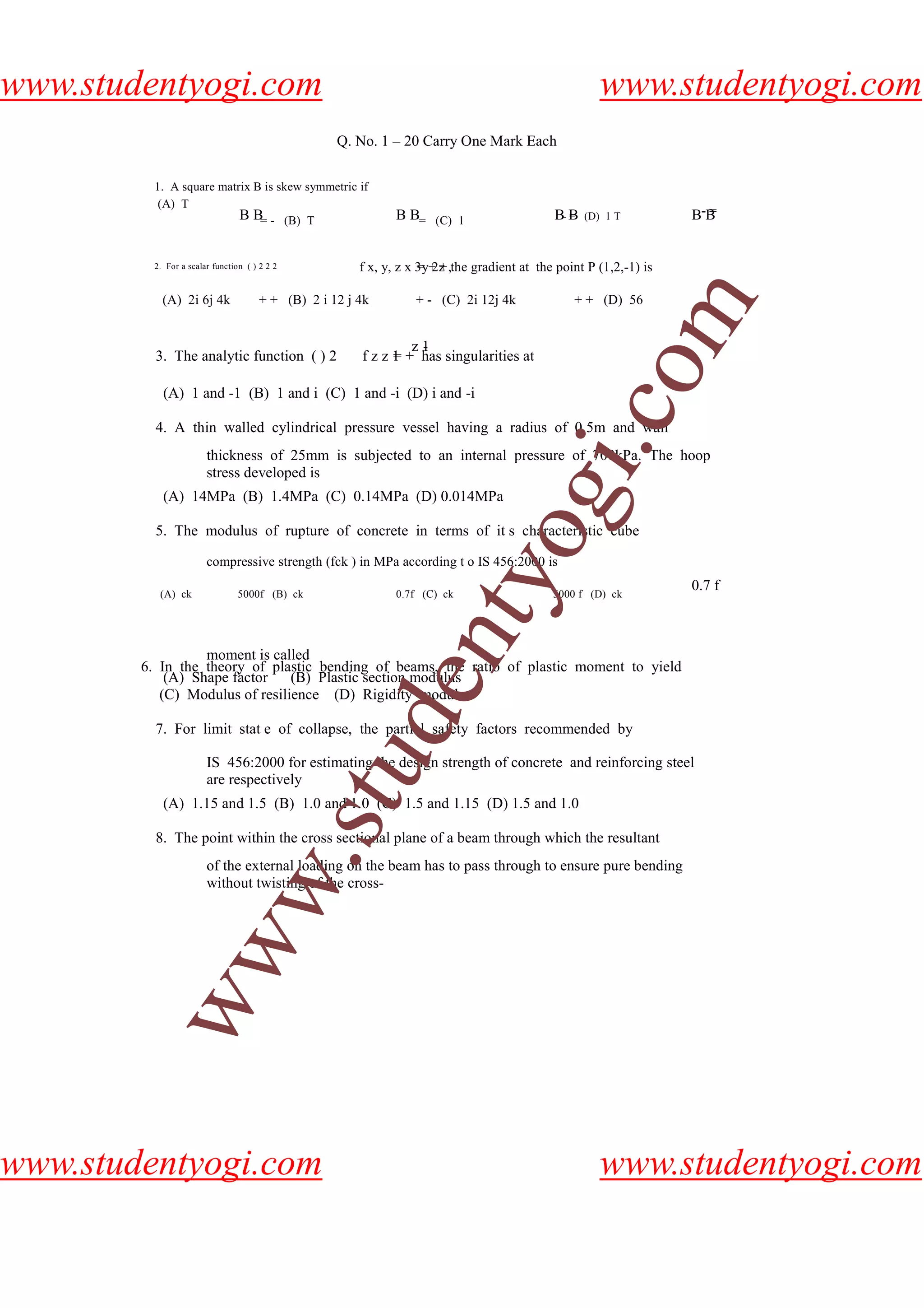 The document contains 8 multiple choice questions related to engineering concepts. Question 1 asks about the definition of a skew symmetric matrix. Question 2 asks about calculating the gradient of a scalar function. Question 3 asks about the singularities of an analytic function. Question 4 asks about calculating hoop stress in a cylindrical pressure vessel. Question 5 asks about the modulus of rupture of concrete related to its compressive strength. Question 6 asks about the term used for the ratio of plastic moment to yield moment in plastic bending theory. Question 7 asks about partial safety factors for design strength of concrete and reinforcing steel. Question 8 asks about the point through which the resultant of external loading must pass to ensure pure bending without twisting.