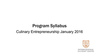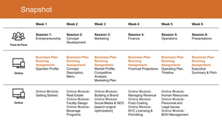 The document outlines a 6-week culinary entrepreneurship program held in January-March 2016. It consists of weekly 8-hour face-to-face sessions on topics like concept development, marketing, and operations. There are also weekly online modules and assignments to submit portions of a business plan. The program helps students develop a new food business concept, create a marketing plan, build financial projections, and pitch their plan to industry experts in a final presentation session.