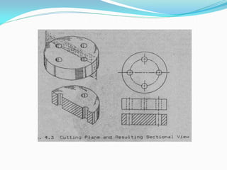 Sectional views show the internal structure of an object by imagining a cut through it. Lines are drawn at 45 degrees called cross-hatching to represent solid metallic portions cut through. The correct method is to draw thin, uniformly spaced lines at 45 degrees to the horizontal unless another angle provides an advantage. Various symbols are used in sectional views to represent different building materials like brick, concrete, steel, etc. and indicate the materials of construction.
