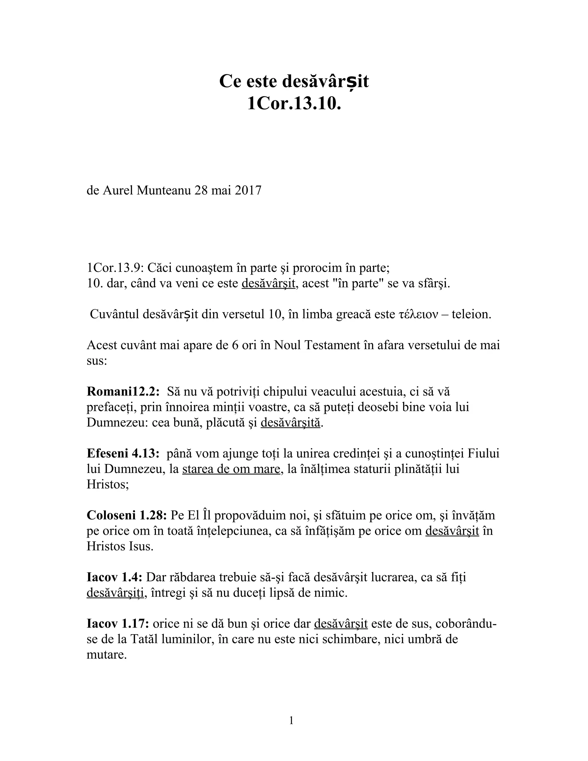 Documentul analizează termenul grecesc 'teleion', tradus ca 'desăvârșit', care apare în 1 Corinteni 13:10 și alte versete, argumentând că se referă la o stare de maturitate spirituală, nu la persoana lui Hristos. Autorul subliniază că dragostea rămâne veșnică, în contrast cu darurile spirituale temporare, cum ar fi prorociile și limbile. Se concluzionează că 'ce este desăvârșit' se referă la cuvântul scris complet, nu la Hristos.