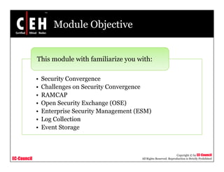Security convergence involves integrating security functions and information across an IP network to improve security performance. It addresses interdependencies between business functions. RAMCAP is a DHS program for security policy based on global risk assessment. Enterprise Security Management (ESM) integrates security event monitoring and analysis. The IPMI standard supports monitoring and managing computer systems out-of-band.