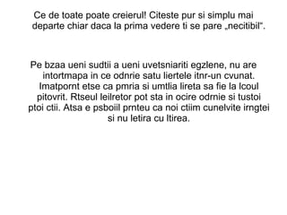 Documentul discută despre iluzia percepției vizuale și cum creierul interpretează imaginile. Sunt prezentate exemple de teste vizuale care dezvăluie modul în care percepția poate fi influențată de așteptări și asocieri memore. De asemenea, se sugerează că percepția la copii poate varia semnificativ în funcție de dezvoltarea lor cognitivă.
