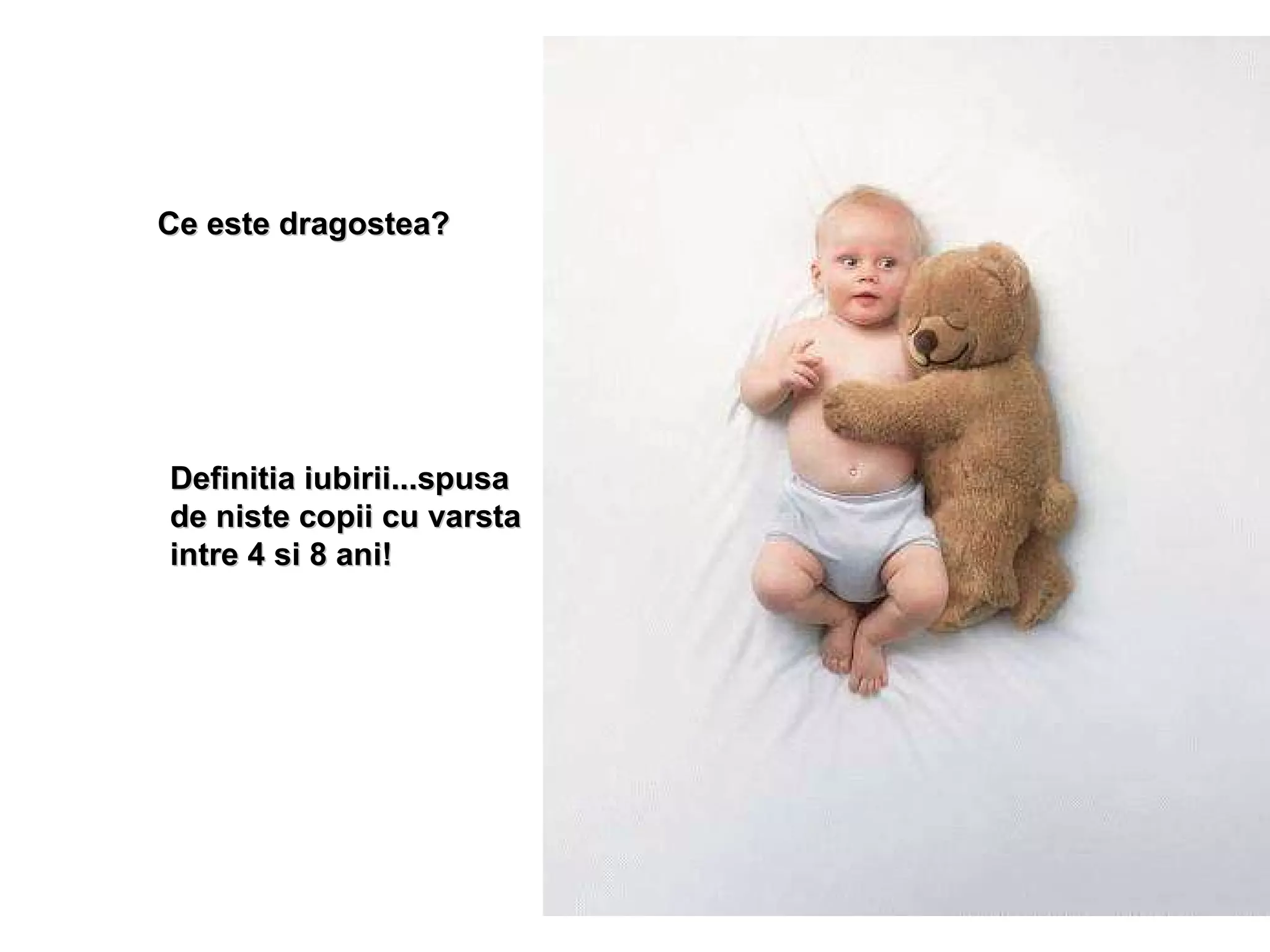 Documentul conține definiții ale dragostei explicate de copii cu vârste între 4 și 8 ani, evidențiind perspectivele lor unice și inocente. Fiecare copil oferă o interpretare diferită a dragostei, inclusiv gesturi simple, empatie și bunătate. Aceste definiții reflectă complexitatea emoției iubirii prin prisma experiențelor lor cotidiene.