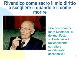 Il documento discute il diritto di un individuo a decidere quando e come morire, esplorando diverse posizioni filosofiche e religiose sulla sofferenza e la dignità della vita. Viene considerata la sofferenza come un elemento complesso, con opinioni che variano tra la necessità di alleviarla e il suo significato redentivo. Si sottolinea l'importanza di assistere i malati terminali e il contrasto tra le visioni cristiane e le filosofie laiche riguardo al valore della vita e della sofferenza.