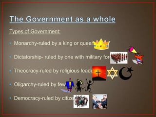 This document summarizes different types of governments and the development of government in both Europe and the American colonies. It discusses the transition from colonies being ruled by England to the establishment of representative democracy in the United States. Key events include the signing of the Magna Carta, Enlightenment thinkers influencing ideas of government, various acts passed by Britain that taxed the colonies leading to the American Revolution, the writing and signing of the Declaration of Independence, challenges faced under the Articles of Confederation, and compromises made at the Constitutional Convention to establish the US system of government.