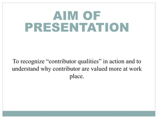 1) The document discusses an interview presentation about contributor personality traits. It focuses on identifying qualities like genuine value, trust, concern for others, and finding solutions that make contributors valued in the workplace.