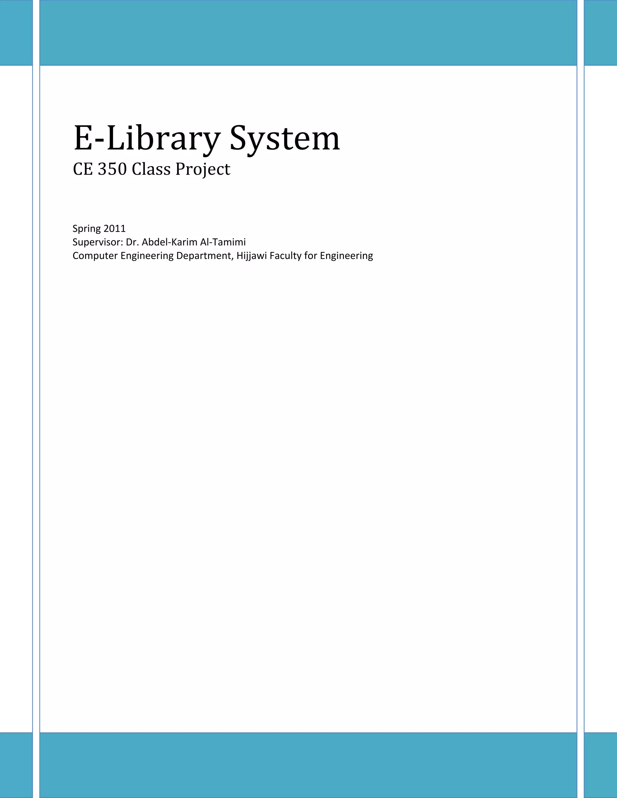 The document describes an e-library system being developed for a university. It includes 3 sections: [1] an introduction describing the goals of allowing students to access and borrow electronic books, library staff to manage operations, and data entry operators to input book information; [2] an initial use case diagram showing basic user interactions; [3] the process for students to select, view, and print pages from electronic books, which involves logging in, searching, selecting a book, choosing pages to print, and paying printing fees deducted from their account.