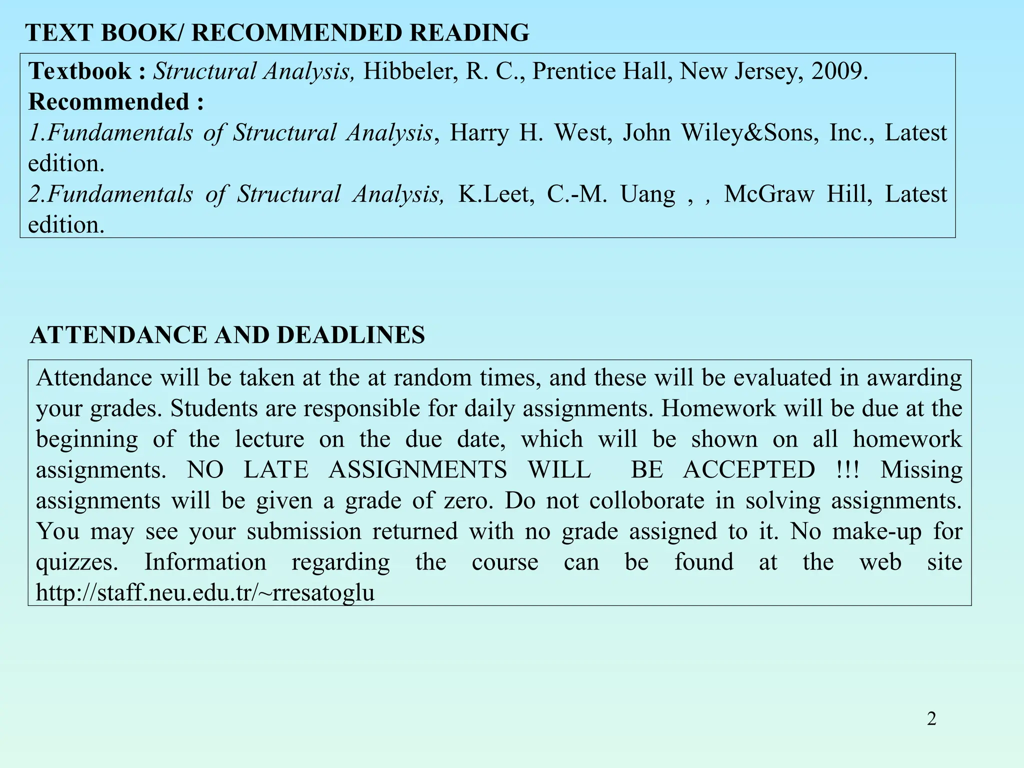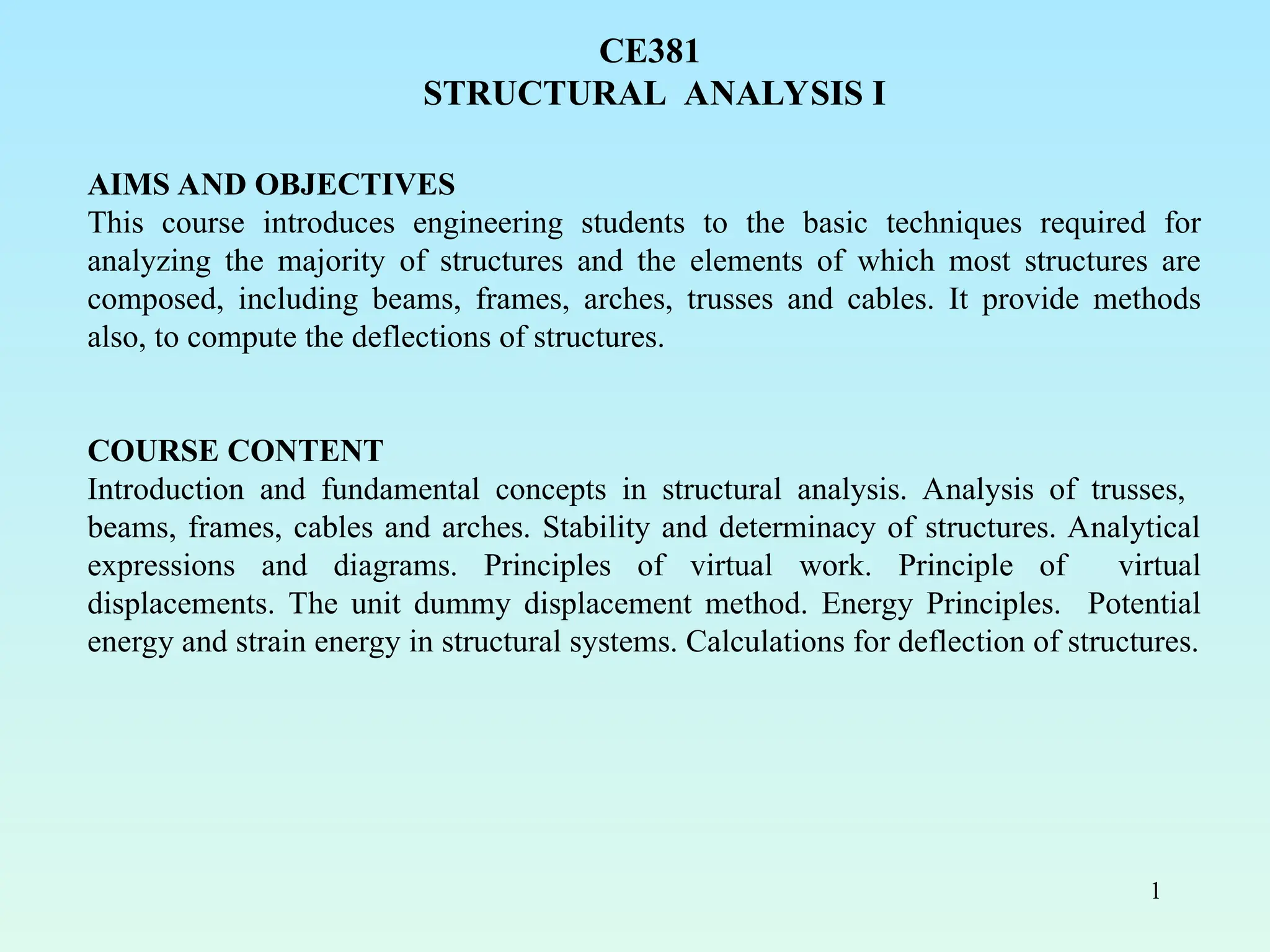 The document outlines the aims and objectives of a structural analysis course aimed at engineering students, covering essential techniques for analyzing various structural elements such as beams and trusses. It details course content, attendance policies, assignment guidelines, and the importance of understanding mechanics and structural behaviors under forces. Key topics include response to loads, safety, economy, utility, design considerations, and classifications of beams and structural forms.