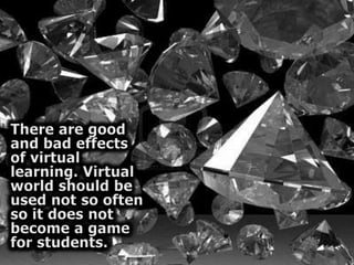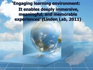 This document discusses the use of virtual worlds like Second Life for educational purposes. It provides several case studies of institutions that have used Second Life for training activities and collaborative learning. These include Loyalist College which used Second Life to simulate border crossing training for security guards. Several benefits of virtual worlds for education are discussed, such as allowing geographically dispersed students and faculty to meet, and enabling prototyping of real-life productions. However, some potential downsides are also noted, such as students displaying cyberdisinhibition or becoming addicted to the virtual environment.