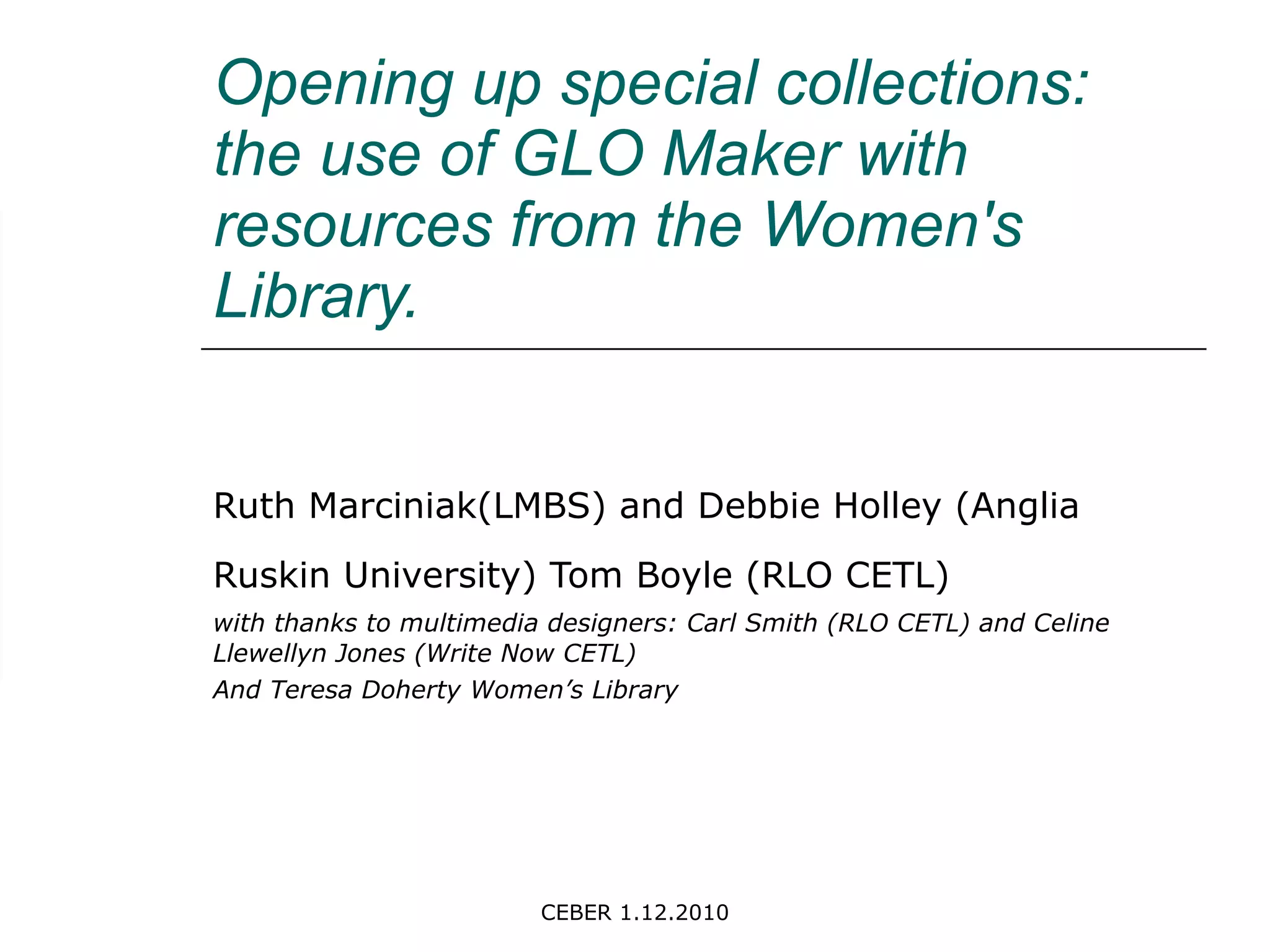 The document discusses a collaboration between the Women's Library and RLO CETL to use the GLO Maker tool to create learning objects from the Women's Library resources. The Women's Library houses the most extensive collection of women's history in the UK, originally established in 1926. RLO CETL develops, shares, and evaluates learning objects and leads innovation in pedagogical design. Through this collaboration, GLO Maker is being used to turn Women's Library resources into interactive learning objects.