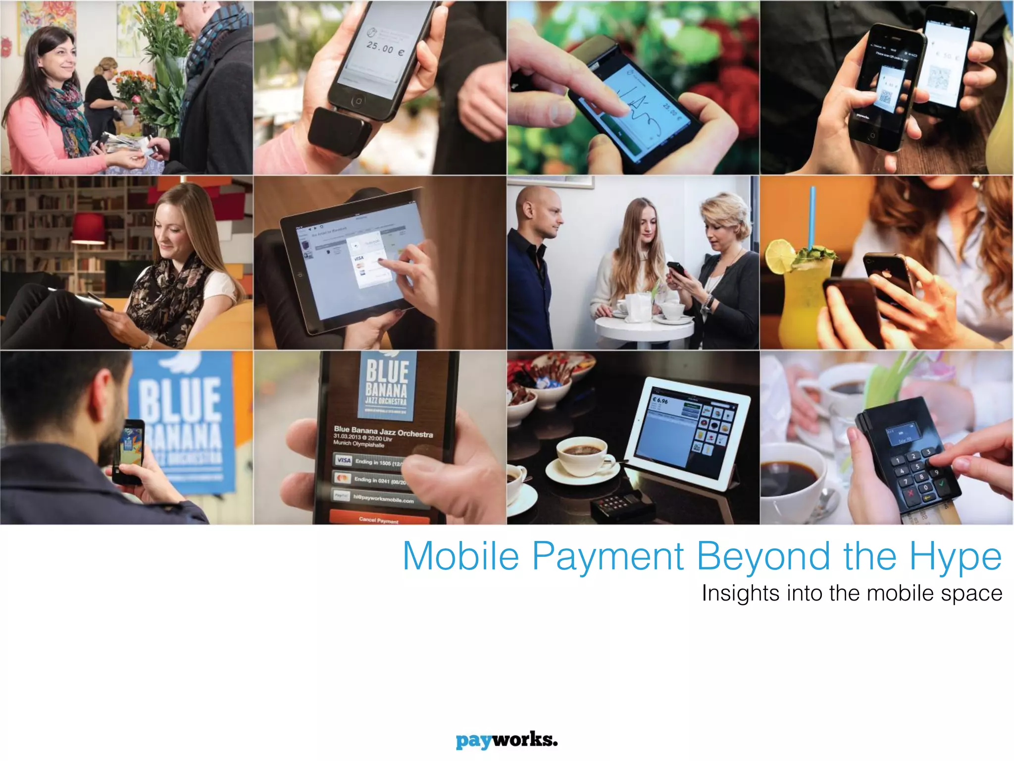 The document discusses mobile payments and provides insights. It notes that current mobile payment solutions do not significantly improve on traditional payment methods in terms of security, availability, risk, and cost. However, mobile payments can enhance the experience and processes around payment by offering services to underbanked merchants, improving sales processes, adding additional services like loyalty programs, and reducing costs. Integrating payments requires coordinating many parties, certifications, and addressing local differences between countries. The goal of payworks is to provide an easy-to-integrate payment platform that allows clients to process card payments on a single independent platform under their own brand.