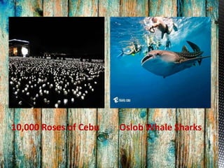Cebu is known for its beaches, waterfalls, and religious sites. Popular attractions include Oslob for whale shark watching, Sumilon Island for its sandbar, and Tumalog Falls. Significant historical and religious landmarks are Fort San Pedro, Simala Church, Basilica del Sto. Niño housing Magellan's Cross, and temples honoring different faiths.