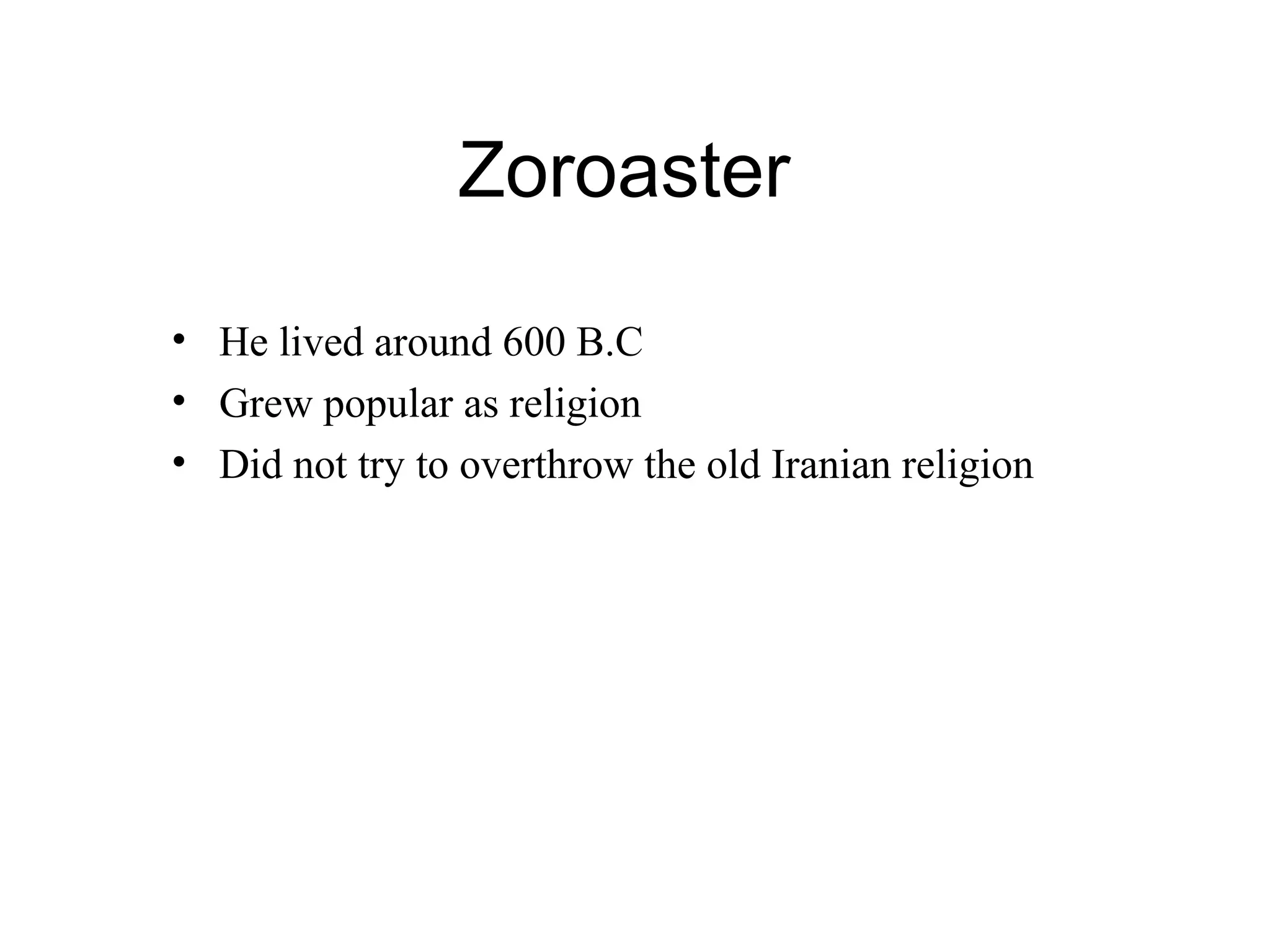 Zoroaster lived around 600 B.C. and his religion grew popular without trying to overthrow the old Iranian religion. He was a prophet who lived in ancient Iran and helped spread a new monotheistic faith called Zoroastrianism without directly challenging existing religious traditions.