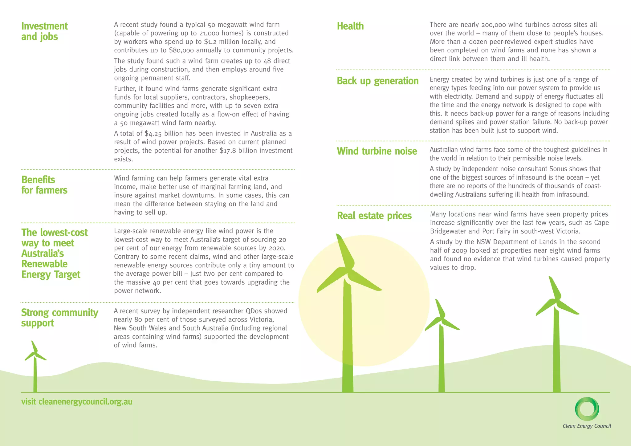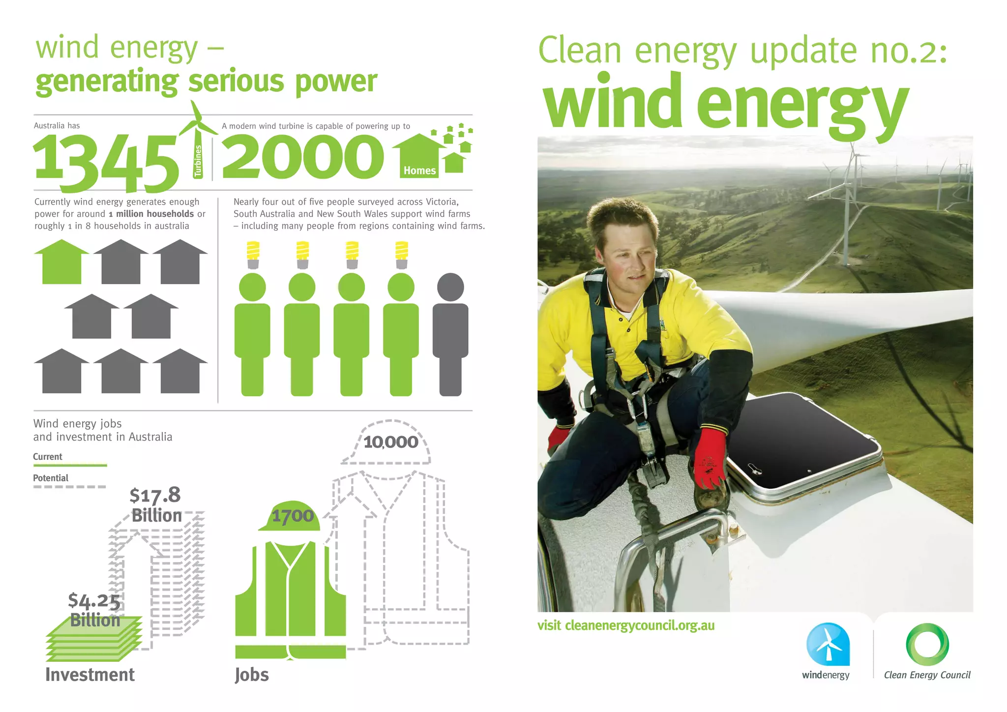 Wind energy currently generates enough power for around 1 million Australian households. A modern wind turbine is capable of powering up to 10,000 homes. Wind farms invest billions in the Australian economy and support thousands of jobs. Community support for wind farms is strong, with nearly 80% of those surveyed supporting wind farm development. Multiple studies have found no direct health impacts from wind turbines.