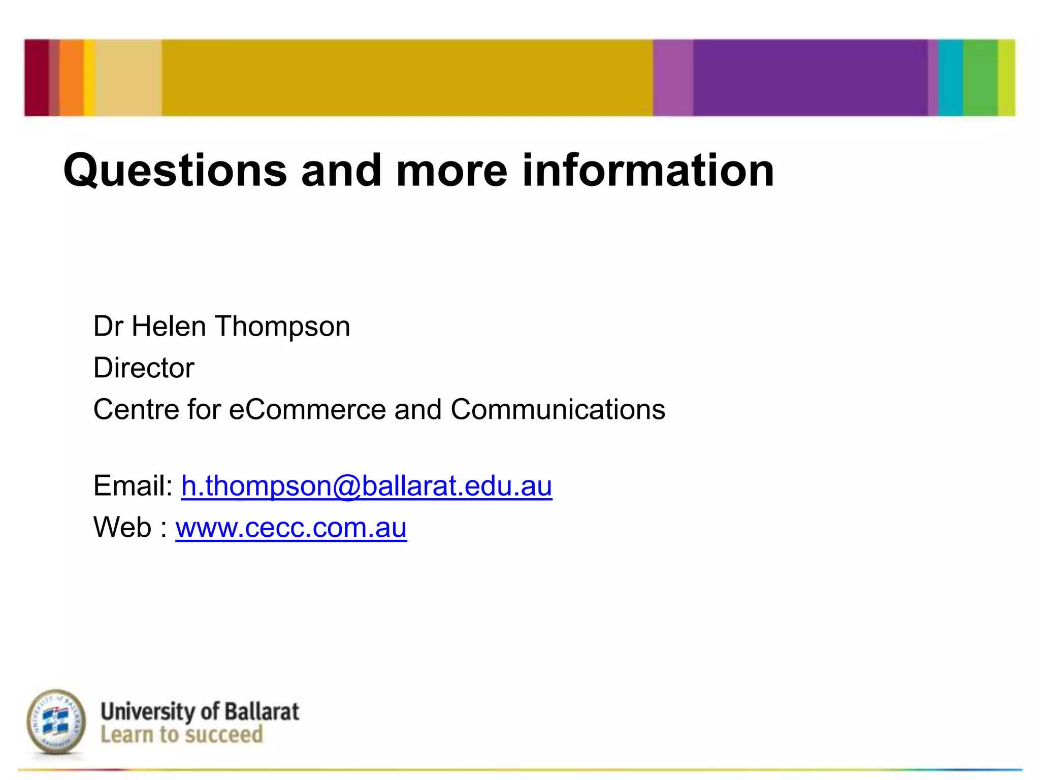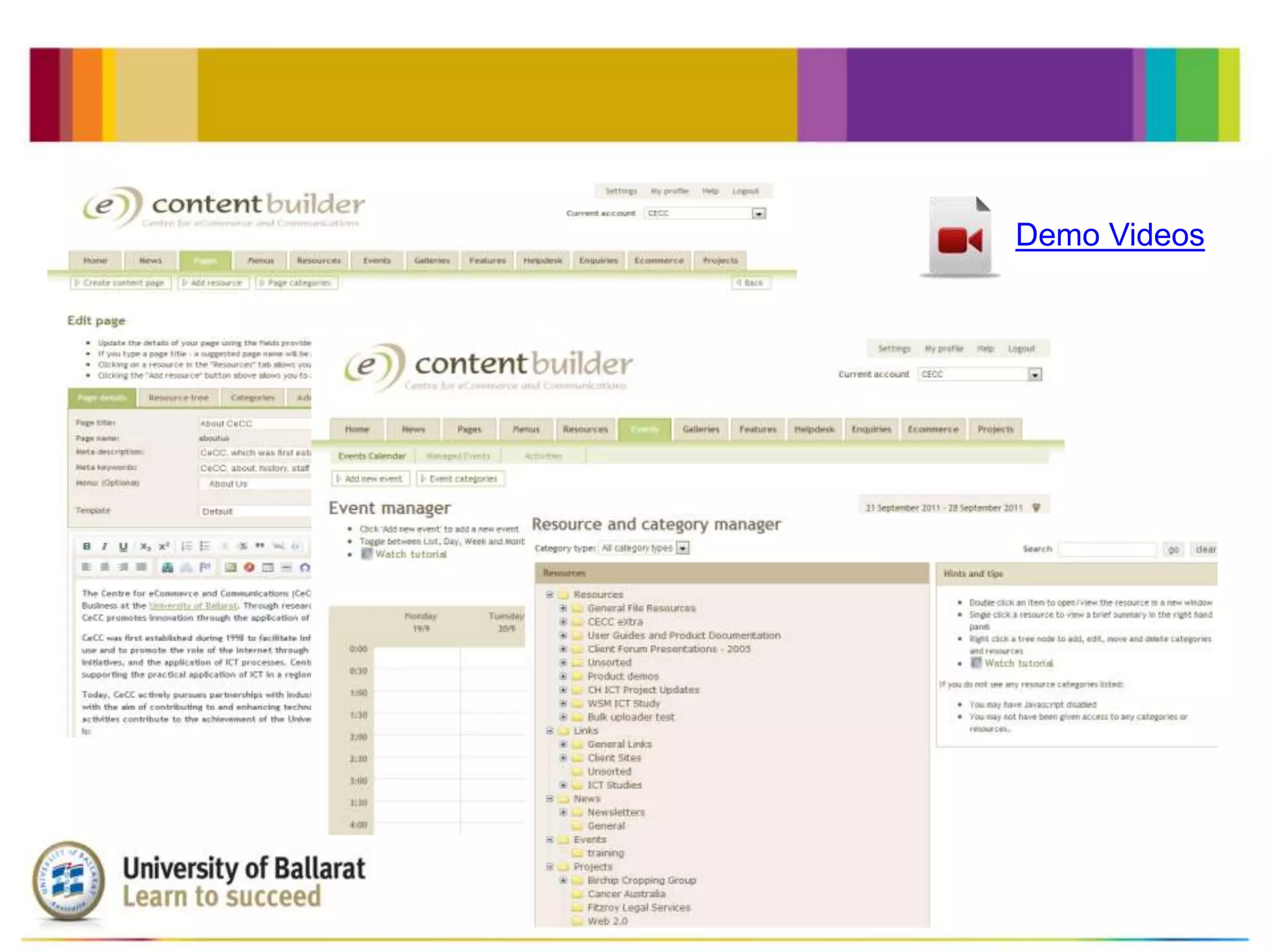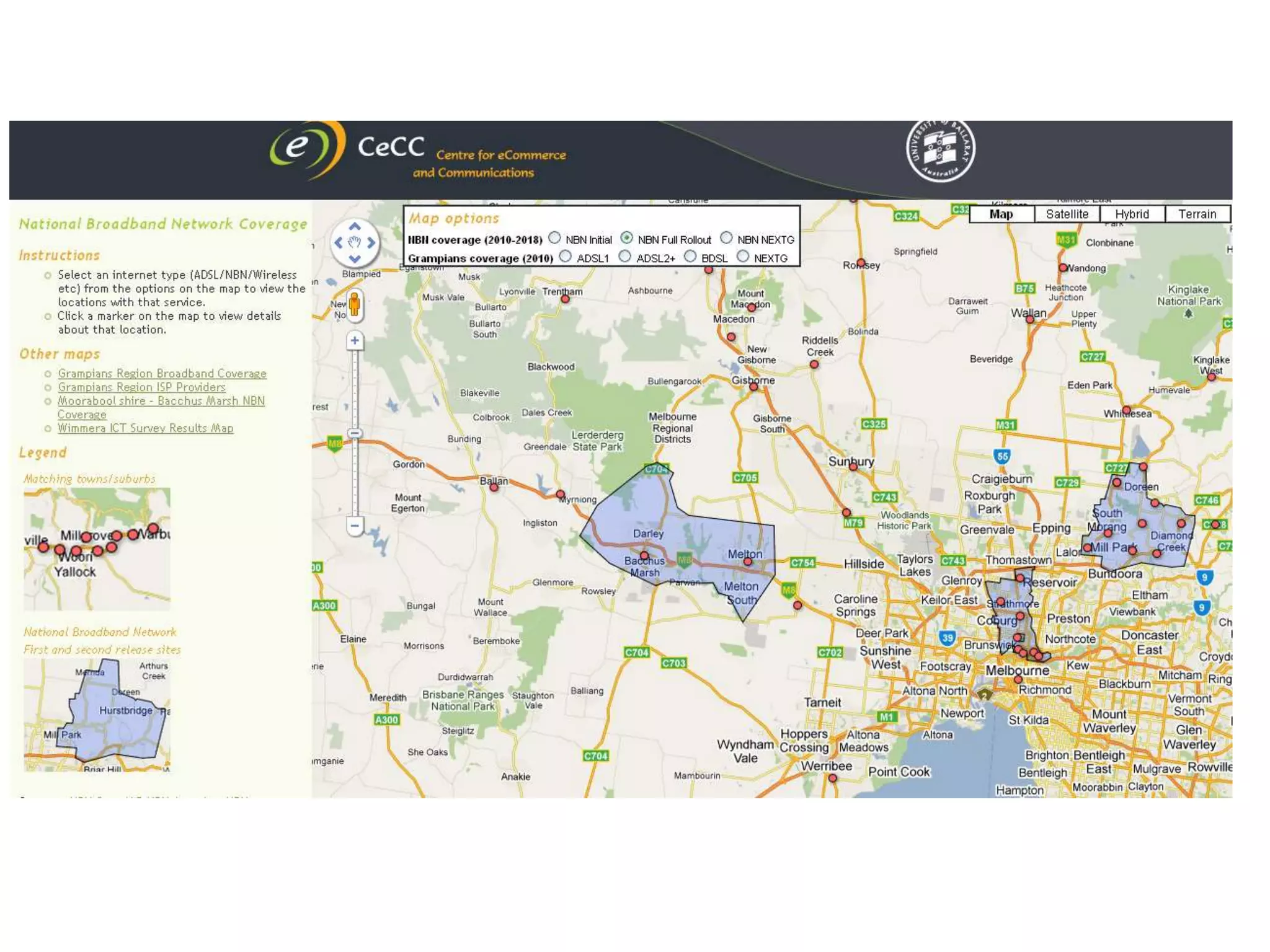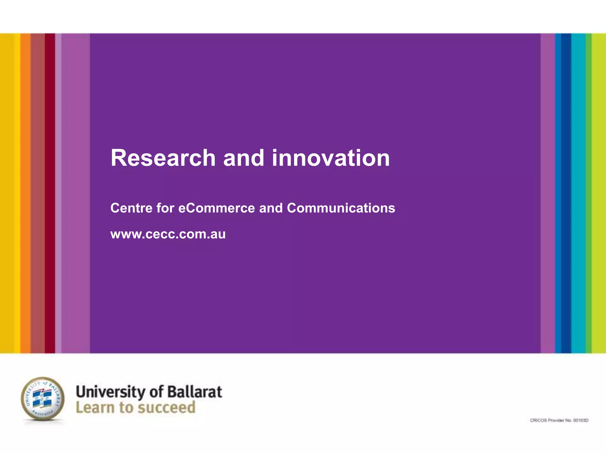 The Centre for eCommerce and Communications (CeCC) focuses on understanding the impact of information and communication technologies (ICT) through collaborative research. It aims to transfer knowledge to others and promote broadband access and effective ICT use. CeCC partners with organizations across various industries and communities. It conducts initiatives such as supporting collaborative monitoring and introducing stakeholders to new technologies. CeCC also provides innovation research, content management systems, and takes a community building approach to its work.