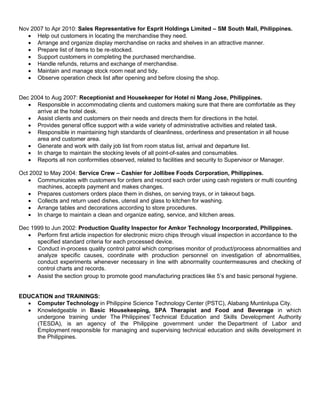 Cecile Amper is seeking a customer service or administrative position. She has over 15 years of experience in customer service, operations, sales, and inventory management across various industries. Her experience includes roles at Dubai Duty Free, Bestsellers Group, Kenny Rogers Roasters, Esprit Holdings Limited, Hotel ni Mang Jose, Jollibee Foods Corporation, and Amkor Technology Incorporated in the United Arab Emirates and Philippines. She has strong communication, relationship building, and problem-solving skills.