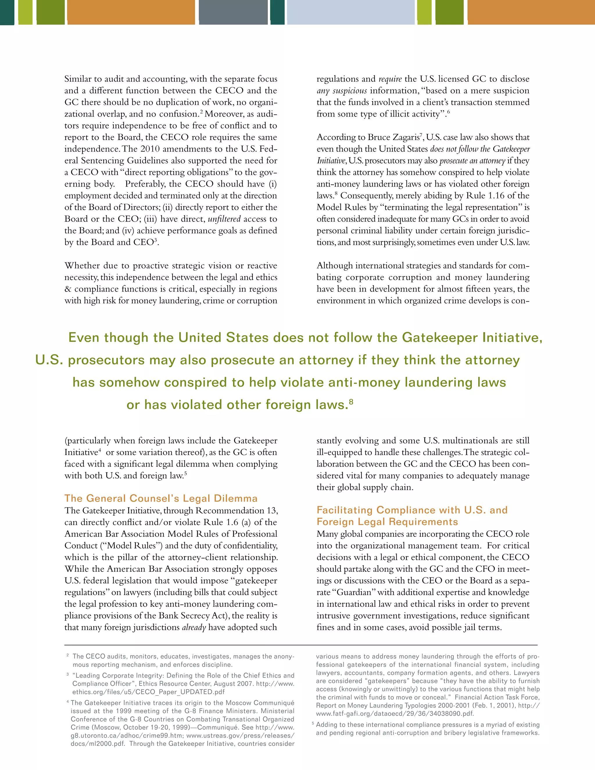 The document discusses the strategic value of having a Chief Ethics & Compliance Officer (CECO) that is independent from the legal department. It notes that the CECO's role has emerged to address issues where compliance was previously handled by legal or HR. The CECO should report directly to the board rather than legal to avoid conflicts between US and foreign laws. Maintaining independence of the CECO and legal functions is important for companies operating in high-risk regions to manage compliance with anti-bribery, money laundering, and corruption laws.