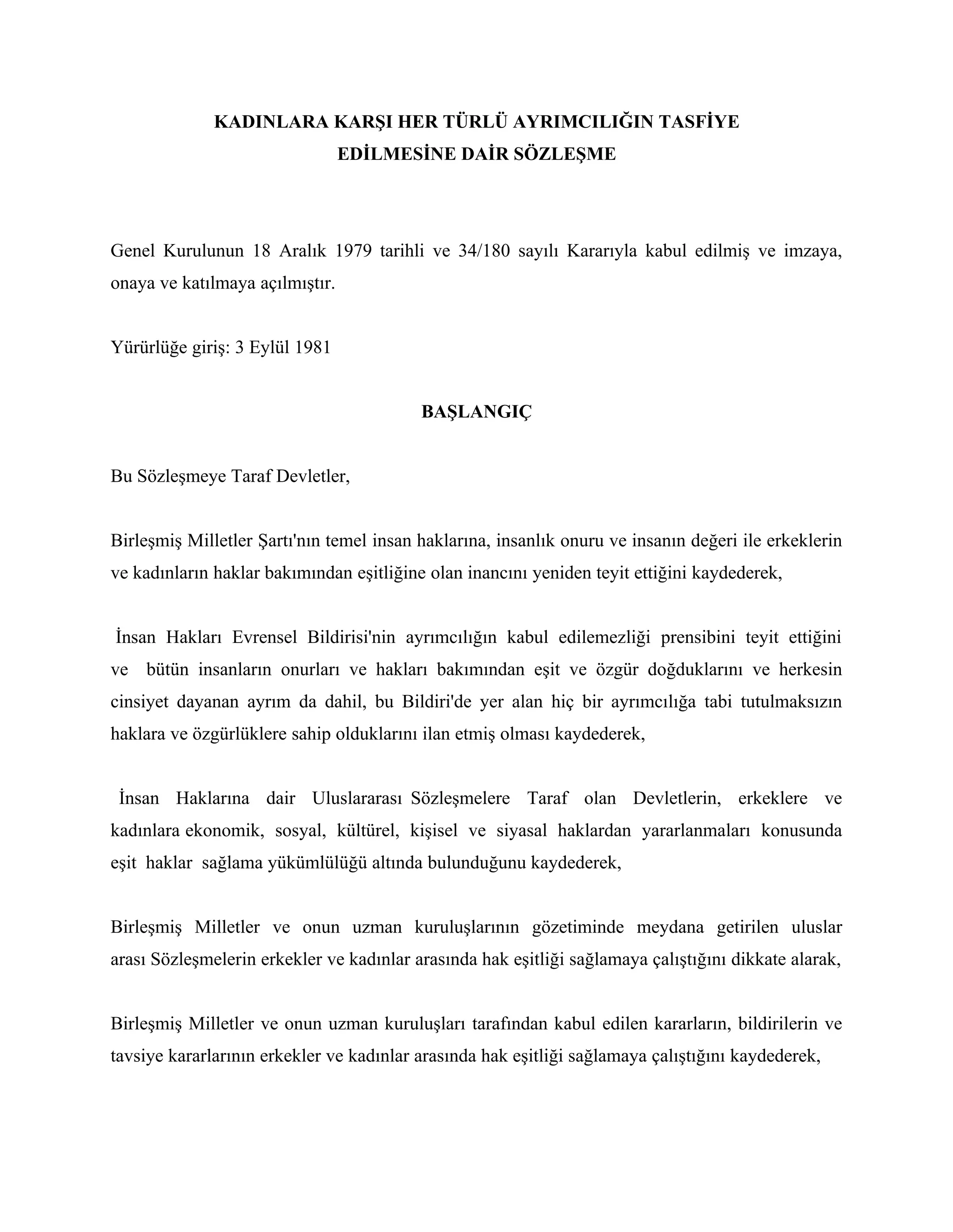 Genel Kurulunun 18 Aralık 1979 tarihli ve 34/180 sayılı Kararıyla kabul edilmiş ve imzaya,