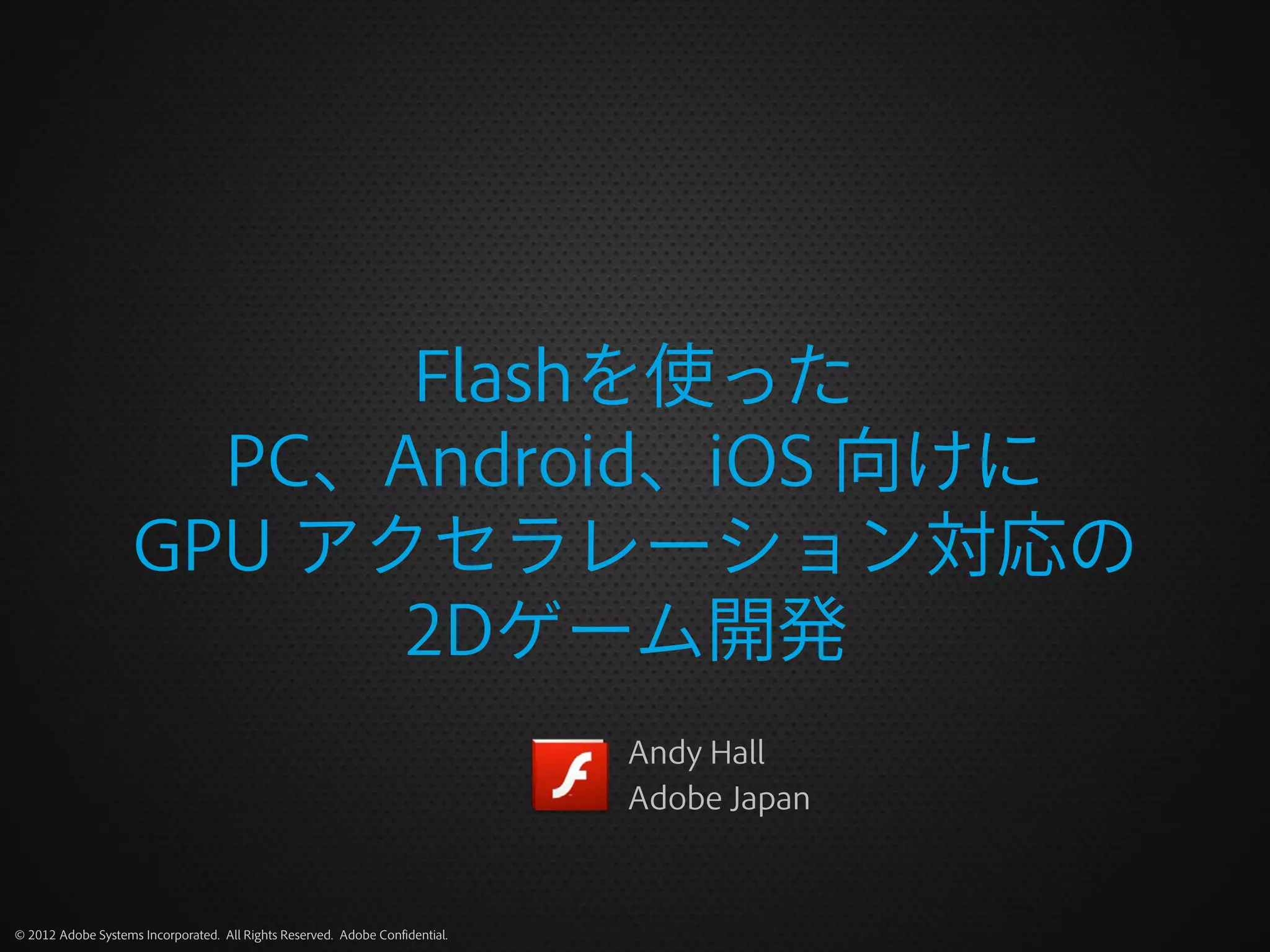 The document discusses using Flash for 2D game development on PC, Android, and iOS with GPU acceleration. It covers Stage3D and AGAL for GPU rendering, and Starling as an open-source framework that provides a familiar display list API for building 2D games with Stage3D. Code examples are shown for using Starling and Stage3D to take advantage of hardware acceleration.