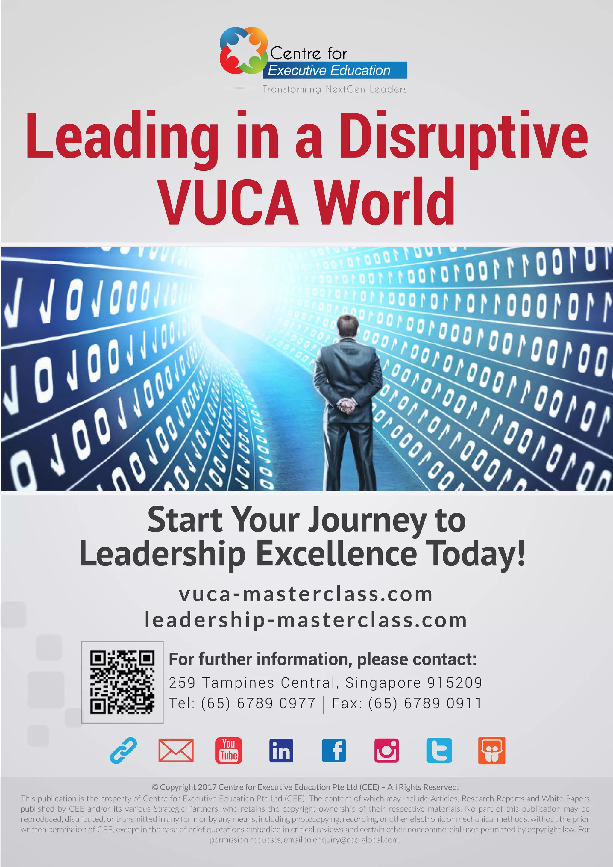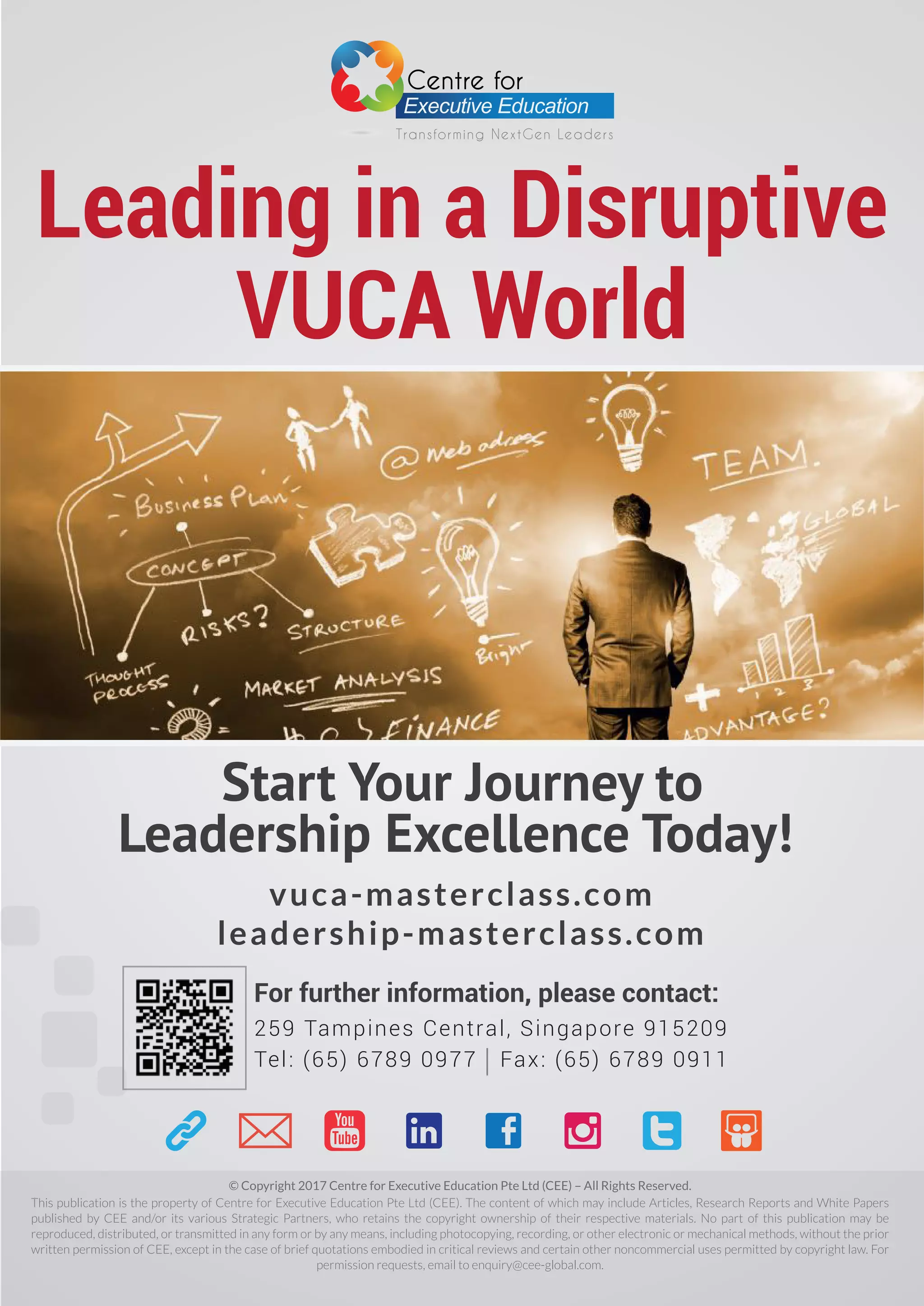 The document outlines the challenges and strategies for leaders operating in a VUCA (volatile, uncertain, complex, and ambiguous) world, emphasizing the need for new leadership competencies to navigate this disruption. It discusses the importance of emotional and social intelligence and managerial coaching as essential skills for leaders to engage employees and enhance organizational performance. The document promotes various masterclasses aimed at developing these critical skills for leadership excellence.