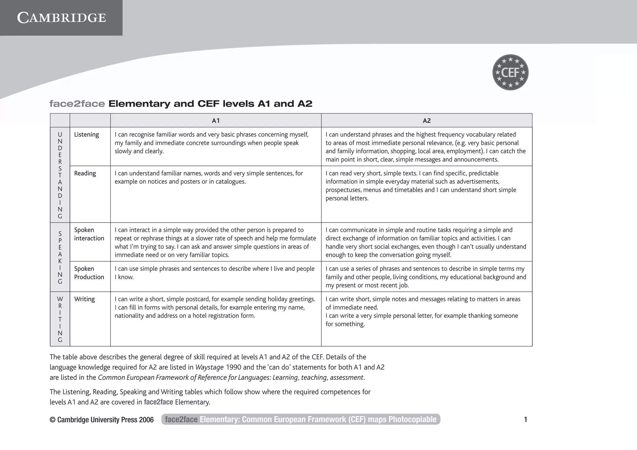 This document provides information about language skill levels according to the Common European Framework of Reference (CEF). It includes tables that describe the listening, reading, speaking and writing skills expected at CEF levels A1, A2, B1, B2 and C1. It also notes that the face2face language course series covers these levels and maps the skills taught in each book to the CEF requirements.