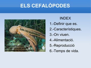 ELS CEFALÒPODES INDEX1.-Definir que es. 2.-Característiques. 3.-On viuen. 4.-Alimentació. 5.-Reproducció 6.-Temps de vida.