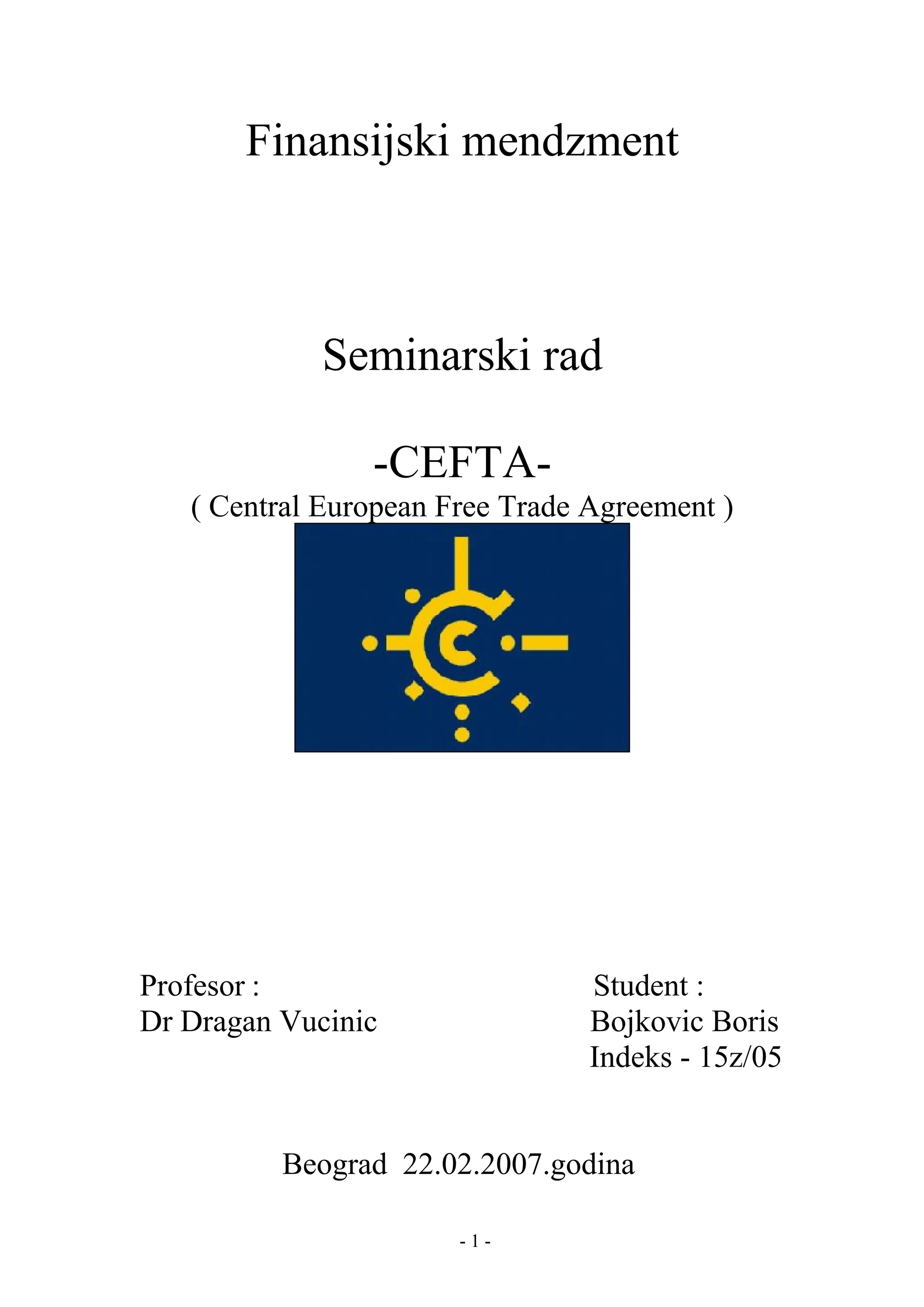 This document is a seminar paper on CEFTA (Central European Free Trade Agreement). It was written by Boris Bojkovic for professor Dr. Dragan Vucinic. The paper provides basic information about CEFTA, including that it is an intergovernmental organization that aims to establish a free trade area between its member states.