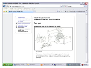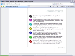 This document provides instructions for a training program to familiarize users with the Common European Framework of Reference for Languages (CEF). The training involves 6 steps: 1) selecting a language skill, 2) choosing a communicative task, 3) reading the task description, 4) completing the task, 5) rating the task difficulty, and 6) checking the user's rating against the trainer's rating. The goal is to help users scale language skills and assess task and performance levels as defined by the CEF.
