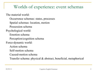 The document discusses various schemas related to space and motion that structure human experience and language. It describes occurrence schemas involving states and processes, spatial schemas involving location and motion, and force-dynamic schemas involving actions. It provides examples of prepositions and verbs used to describe spatial relationships in English and other languages, and analyzes differences in how languages conceptualize locations.