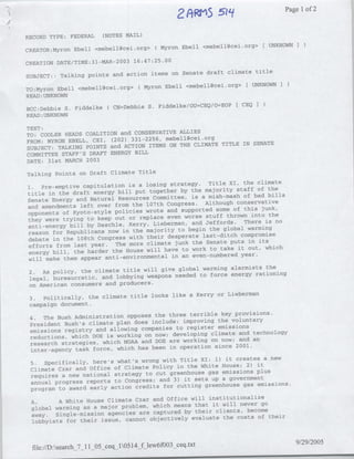 This document contains talking points and action items regarding a climate title in a draft energy bill from the Senate Energy and Natural Resources Committee. It argues that the climate title is a pre-emptive capitulation that will empower climate alarmists and lobbyists. Specifically, it criticizes provisions to create a new Climate Czar, require a national emissions reduction strategy, and award credits for early reductions. The document urges contacting Senators on the committee to remove these objectionable provisions from the bill.