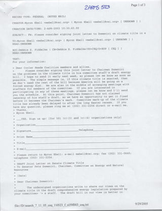 The document is a draft letter from Myron Ebell of the Cooler Heads Coalition urging organizations to sign onto a letter to Senator Pete Domenici regarding problems with the climate title in a draft energy bill. The letter argues that the climate title would set the US on a path towards energy rationing without public debate and concedes the global warming debate. Specifically, it opposes provisions requiring a strategy to reduce emissions, establishing a White House climate office, and awarding credits for early emission reductions, claiming these would institutionalize alarmism and create lobbying groups pushing for emissions caps. The letter asks to focus efforts on the positive elements of the energy bill instead of the objectionable climate title.