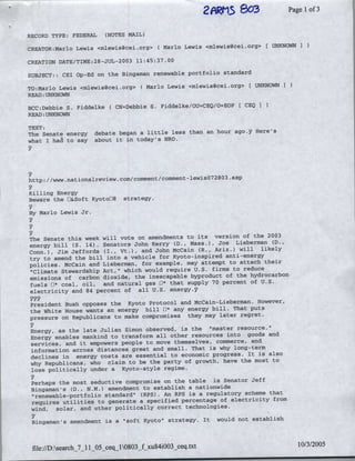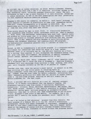 The document is an op-ed arguing against a proposed renewable portfolio standard (RPS) that would require a certain percentage of electricity to come from renewable sources like wind and solar. It summarizes that an RPS would functionally operate like carbon emissions caps by restricting access to more economical fossil fuels and inflating electricity costs. It also argues that an RPS would strengthen lobbying from the renewable industry and likely grow over time into higher requirements. The op-ed urges Republicans in the Senate to reject compromises like the proposed RPS in order to avoid distorting energy markets and increasing costs for consumers.