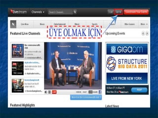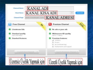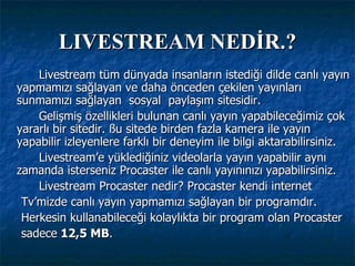 LIVESTREAM NEDİR.? Livestreamtüm dünyada insanların istediği dilde canlı yayın yapmamızı sağlayan ve daha önceden çekilen yayınları sunmamızı sağlayan sosyal paylaşım sitesidir. Gelişmiş özellikleri bulunan canlı yayın yapabileceğimiz çok yararlı bir sitedir. ßu sitede birden fazla kamera ile yayın yapabilir izleyenlere farklı bir deneyim ile bilgi aktarabilirsiniz. Livestream’e yüklediğiniz videolarla yayın yapabilir aynı zamanda isterseniz Procaster ile canlı yayınınızı yapabilirsiniz. Livestream Procaster nedir? Procaster kendi internet Tv’mizde canlı yayın yapmamızı sağlayan bir programdır. Herkesin kullanabileceği kolaylıkta bir program olan Procaster sadece 12,5 MB .
