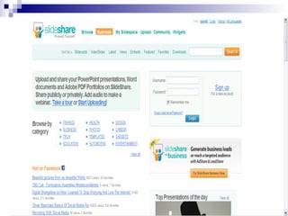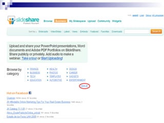 SLIDESHARE NEDİR? Günlükve bilimsel çalışmalarda çok sık kullanılan sunumların tek bir sayfadan kolaylıkla erişimini sağlayan Slideshare aynı zamanda dünyanın en büyük sunum paylaşım sitesidir. Slideshare sayesinde herhangi bir kullanıcı araştırmada bulunduğu konuyla ilgili sunumları istediği gibi etiketleyip indirebilmekte kendi ürettiği sunumları da diğer kişilerle paylaşabilmektedir.