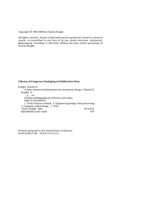 The document is a primer on the finite element method for mechanical design, intended as a supplementary text for mechanical engineering courses. It focuses on practical modeling, evaluation, and interpretation of results while introducing theoretical concepts as needed. The text emphasizes the importance of correct modeling and user skill to ensure accurate results, highlighting the method's applications in trusses, beams, frames, and solid structures.