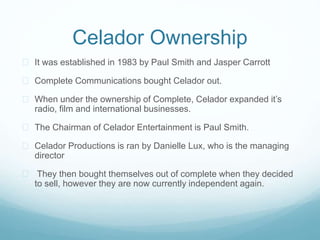 Celador is an independent British film and television production company established in 1983. It produces films with small budgets between $3-45 million and makes profits in the millions. To fund productions, Celador sometimes partners with other small companies and uses profits from previous productions. It employs freelance specialists for each film role. Currently Celador has produced 8 films and owns 4 radio stations and television production companies, establishing itself in the UK entertainment industry since the 1980s.