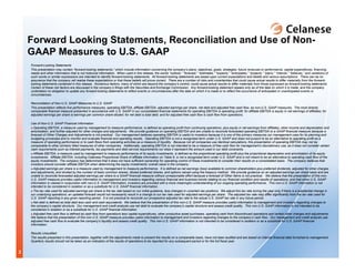 The document summarizes Celanese's 2Q 2008 earnings conference call. It includes an agenda with the Chairman and CEO and SVP and CFO scheduled to speak. It also provides forward-looking statements, non-GAAP reconciliations, and describes results as unaudited. Key highlights are record net sales for the quarter driven by higher pricing and volumes in Asia, though operating profit and EPS declined from significantly higher raw material costs. The company also reaffirms its path to achieving operating EBITDA growth objectives by 2010 through volume growth in advanced materials and further acetate tow penetration.