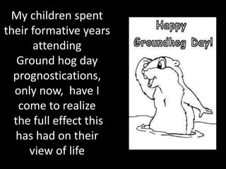 The document discusses how the author's children grew up believing that Groundhog Day was a major holiday because they attended Groundhog Day events every year. As the children got older and moved to a new community, they were surprised to find that not everyone celebrates Groundhog Day. The author reflects on taking their children to see the groundhog prognostications each year, despite the hassles of getting everyone organized and out the door early. The author realized that celebrative moments in life don't need to involve big gifts or expenses, but can be found in spending time together as a family and appreciating the simple things each day.