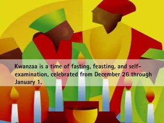 Kwanzaa is celebrated from December 26 to January 1 to honor African heritage and culture. It involves fasting, feasting, and self-reflection. Started in 1966 by cultural nationalists, Kwanzaa is now observed by 18 million people worldwide. The celebration centers around seven principles represented by seven symbols, with each day focusing on a different principle of unity, self-determination, collective work and responsibility, cooperative economics, purpose, creativity, and faith.