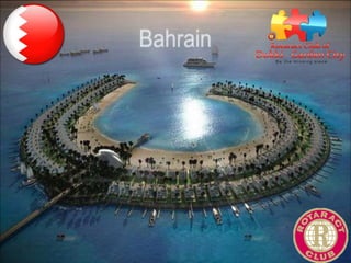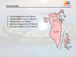 Bahrain is divided into 5 governorates and has a population of over 1.2 million people, most of whom live in the Capital and Central regions. Bahrain has a long history dating back to the Dilmun civilization and was formerly ruled by various empires before gaining independence in 1971. The economy relies heavily on oil and financial services, and most of the workforce is foreign-born. The official religion is Islam and Arabic is the main language, though English is also widely used.
