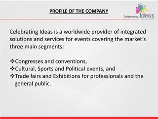 Celebrating Ideas is a full-service marketing and event promotions agency providing integrated solutions for congresses, cultural events, trade fairs, and corporate functions. Since 1991, the company has developed a strong reputation for delivering customized, high-quality event management services, including strategic planning, production, and sponsorship strategies. Their expertise spans various event types, from corporate meetings to entertainment and fashion events, demonstrating a commitment to tailored client needs and effective media coverage.
