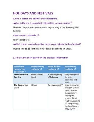 This document discusses various holidays and celebrations around the world. It provides details about Rio de Janeiro's Carnival in Brazil, Día de los Muertos in Mexico, Barranquilla's Carnival in Colombia, and April Fool's Day in the US. It also includes a chart comparing the name, location, date, and activities for some of these celebrations. Finally, it classifies different words as related to activities, food, or specific celebrations.