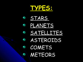 This document outlines and describes different types of celestial bodies including stars, planets, satellites, asteroids, comets and meteors. It notes that stars are big balls of gas that produce light and heat, while planets do not produce light and heat themselves. The document also lists the eight planets in our solar system - Mercury, Venus, Earth, Mars, Jupiter, Saturn, Uranus and Neptune - and provides brief descriptions of each planet and mentions that Earth has one moon.