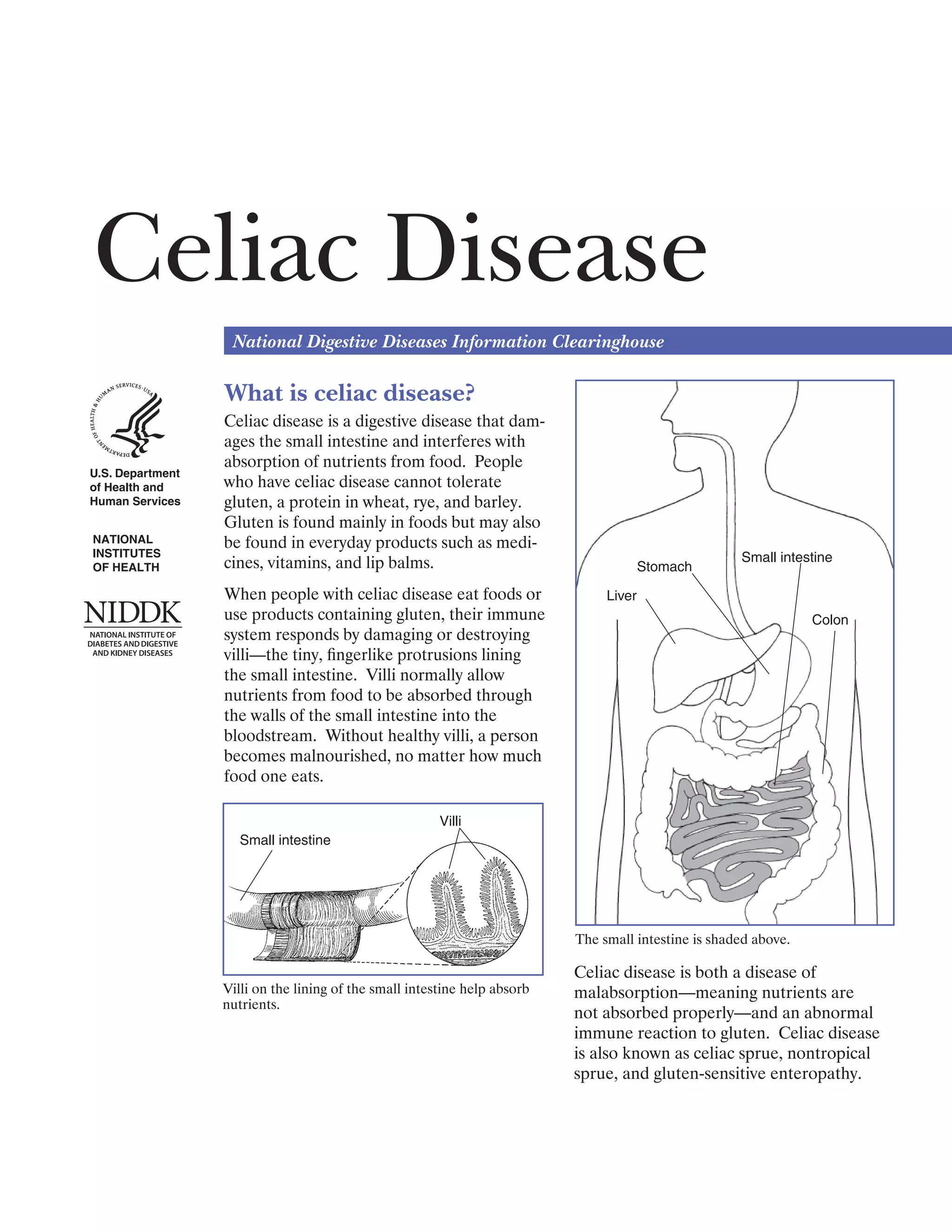 Celiac disease is a digestive disease where eating gluten damages the small intestine and interferes with nutrient absorption. It is an immune reaction to eating gluten, found in wheat, rye, and barley. When people with celiac disease eat gluten, their immune system attacks and damages villi in the small intestine, preventing nutrient absorption. Celiac disease affects about 1 in 133 people in the United States and is underdiagnosed due to its varied symptoms. It is diagnosed through blood tests detecting antibodies and confirmed with a small intestine biopsy. There is no cure for celiac disease other than a lifelong gluten-free diet.
