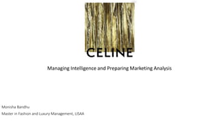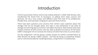 Hedi Slimane was appointed as the creative director of Celine in 2018 and has transformed the brand. He expanded into men's wear, couture, perfumes, and focused on a rock n' roll aesthetic. This has led to both excitement and criticism from Celine's loyal customers. As part of a market analysis, the document discusses Celine's history, competitors, iconic bags, stores, musical collaborations, and does a SWOT analysis. It examines how Slimane has changed the brand and positioning while balancing Celine's heritage.