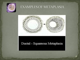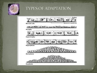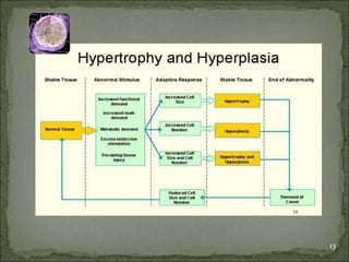 Homeostasis refers to the steady state that cells exist in normally, with an equilibrium between the cells and their environment to allow for adequate functioning. When this balance is disturbed, it can predispose cells to pathology. Cells can adapt to changes through processes along a spectrum, including helpful adaptations like hypertrophy (increase in cell size) and hyperplasia (increase in cell number), or more harmful adaptations that can lead to cell injury or death if the stress cannot be adapted to. Adaptations may involve changes in cell size or number, or changes to a different cell type through metaplasia. Dysplasia refers to some loss of cellular control, as seen in conditions like cervical dysplasia, and can progress